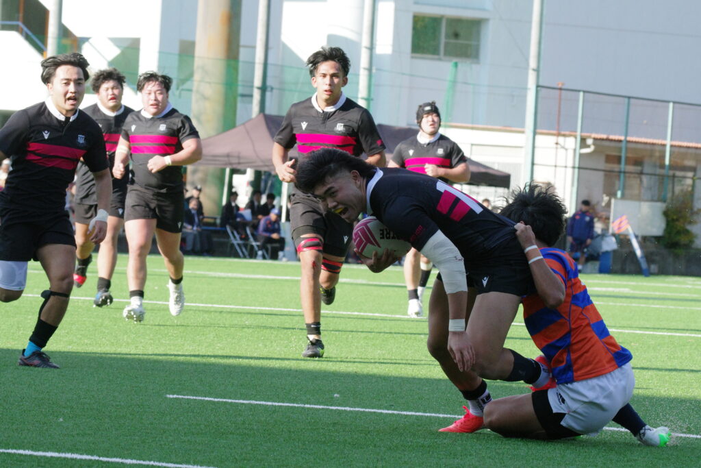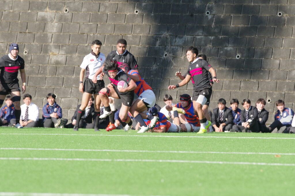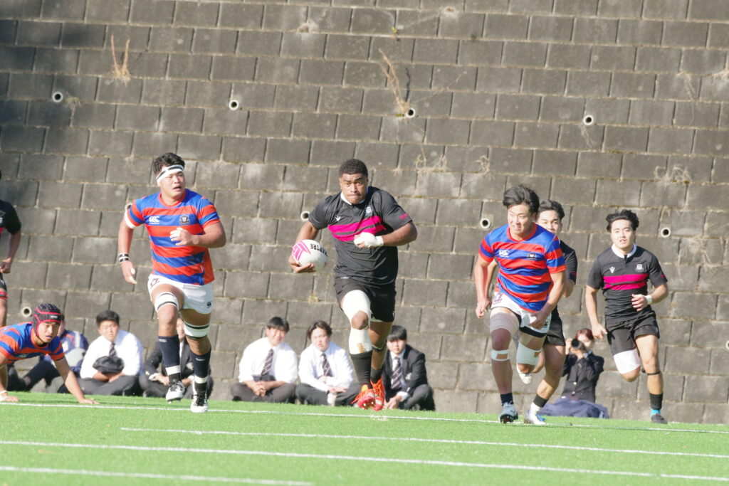 決して弱くはない。今日も1年生・尾形仁が自陣トライライン前のスクラムからアタックしたのを起点に、マラカイの独走、そしてトライゾーンまで持ち込むトライがありました。